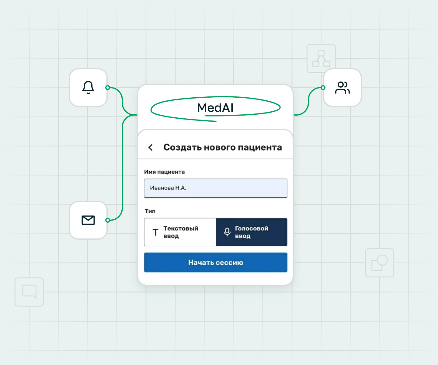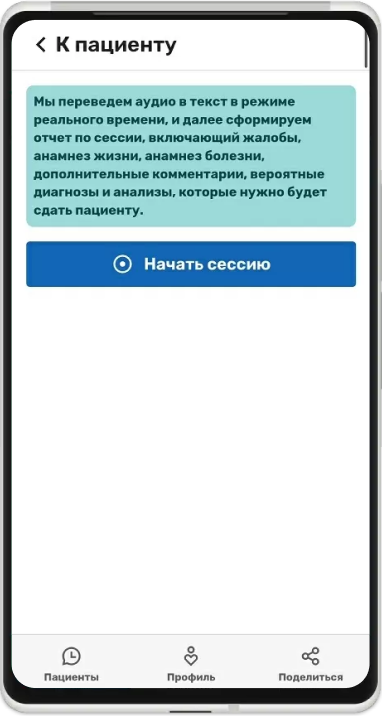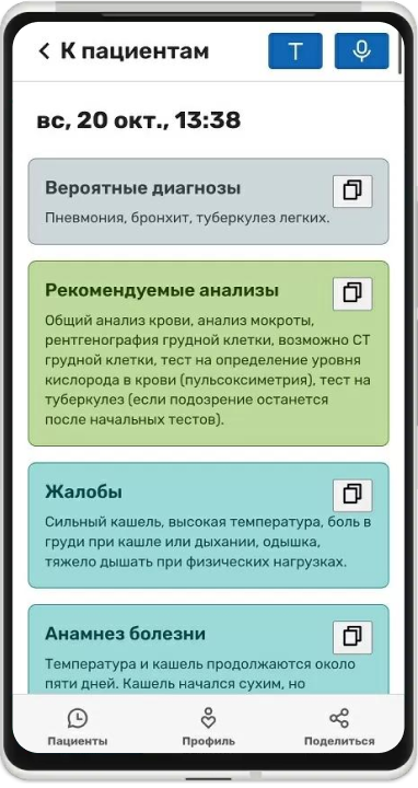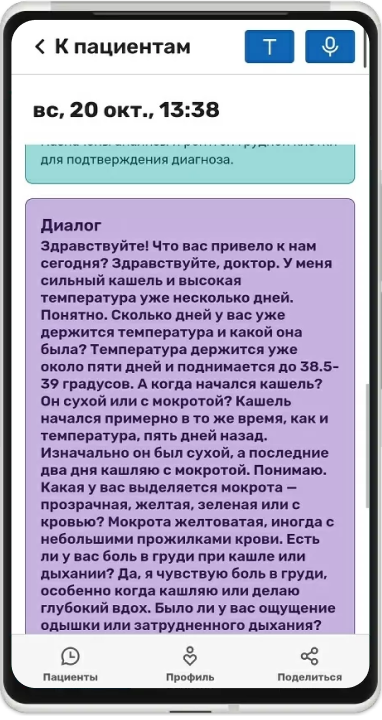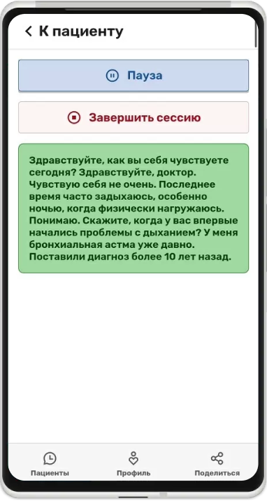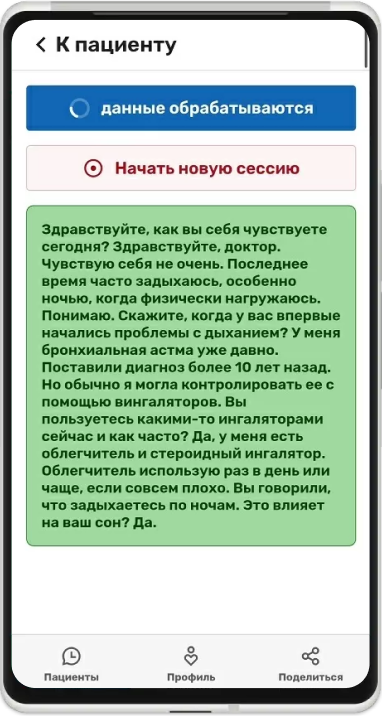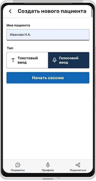 Сконцентрируйтесь на беседе с пациентом и положите рядом смартфон с открытым приложением. Приложение расшифрует голосовой ввод и далее выделит из текста жалобы, анамнез жизни, анамнез болезни и дополнительные комментарии.