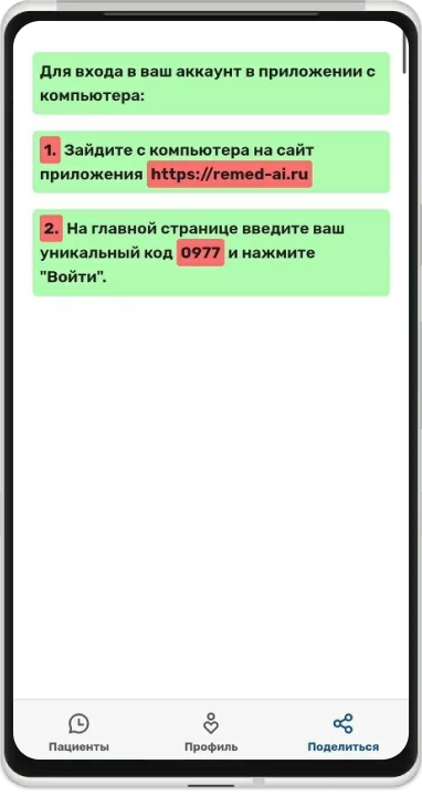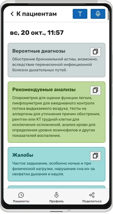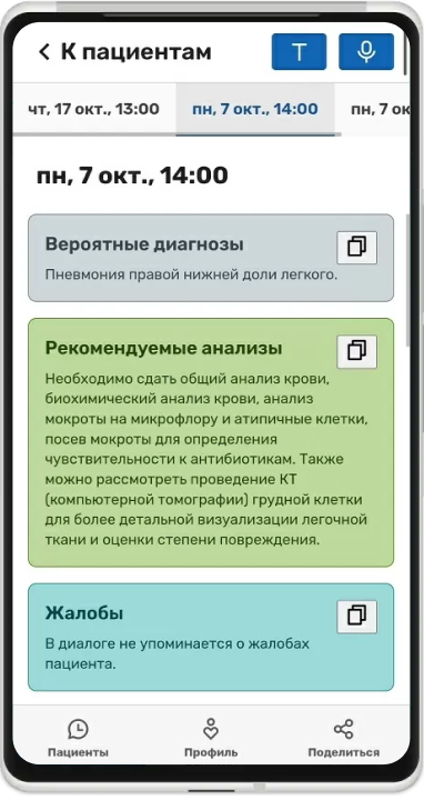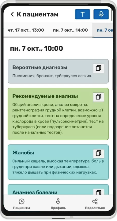После приема пациента вы можете войти в приложение с компьютера и скопировать текст с жалобами и анамнезом в свою медицинскую информационную систему.